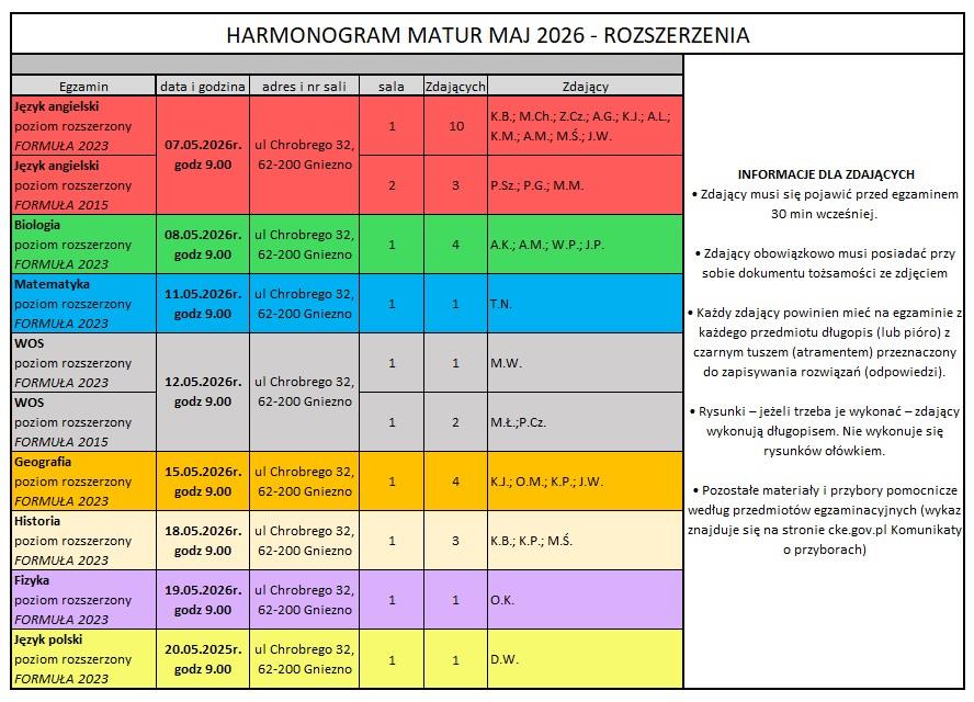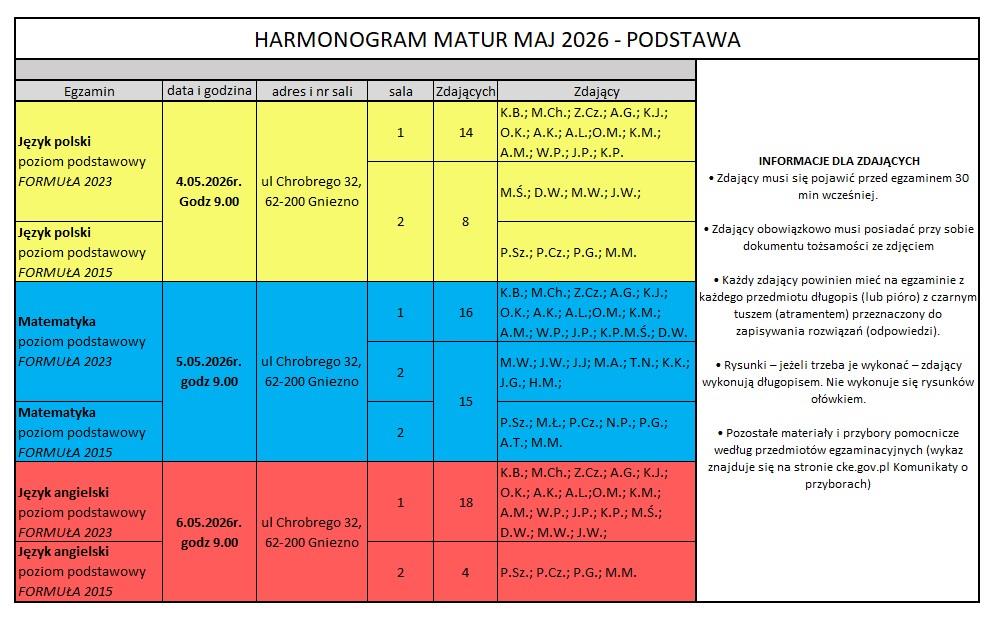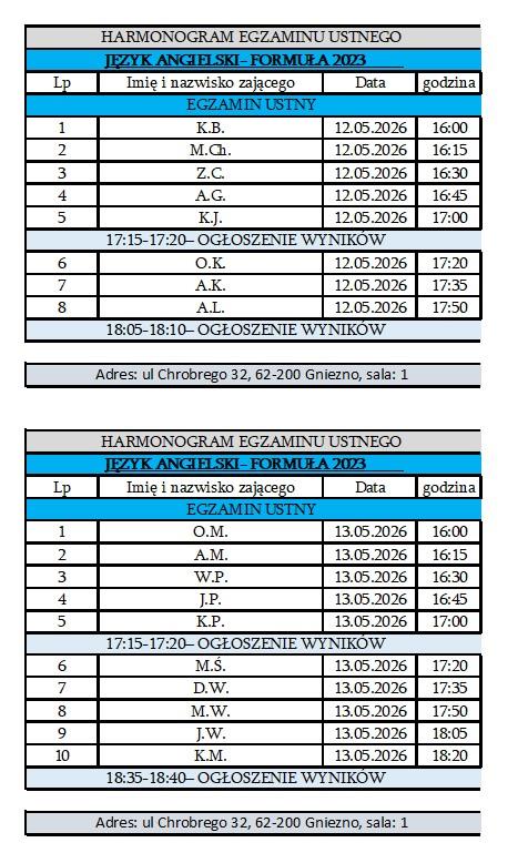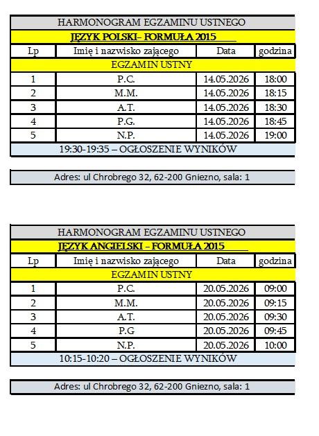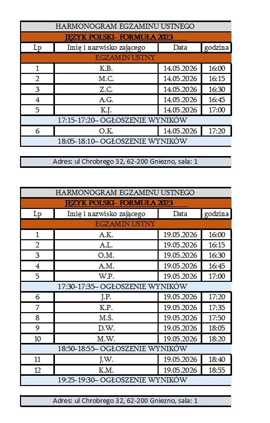 Poniżej publikujemy szczegółowe harmonogramy egzaminów pisemnych oraz ustnych (pliki graficzne):