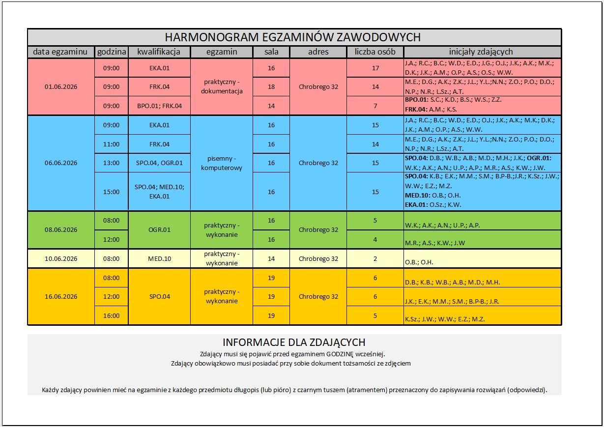 Poniżej publikujemy szczegółowe harmonogramy egzaminów pisemnych oraz praktycznych (pliki graficzne):